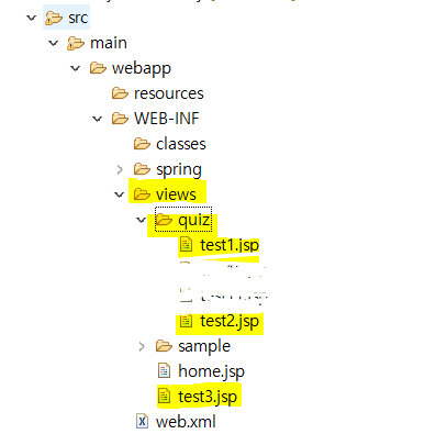 test1, test2, test3을 구현하기 위해선 1개의 폴더(quiz)와 3개의 jsp 파일이 생성되어야 한다. (Controller는 한 곳에서 수행 가능)