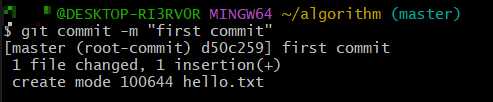깃에 처음올리는 커밋이라는걸 알려주는 명령어 큰따옴표 안에 문구는 다른 문구로 작성해도 된다.