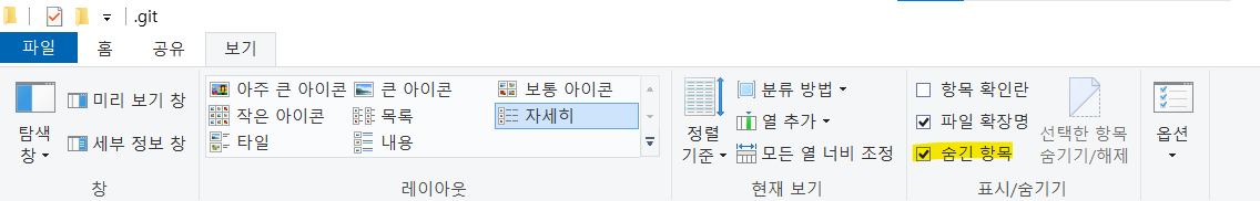 .git 폴더를 보기 위헤서는 폴더 -> 파일 -> 보기 - 숨긴항목 체크를 해줘야 볼 수 있다. 여기가 git의 로컬저장소이다.