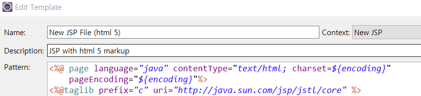 이클립스 -> Windows -> Preference -> Web -> JSP Files -> Templates -> JSP (HTML) -> Edit -> 코드삽입