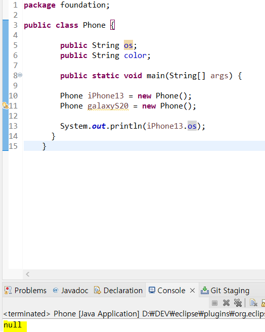 이렇게 Null값이 나오는 이유는 인스턴스 변수인 os에 대한 값을 지정해 주지 않았기 때문에 빈 값만 나오게 된다